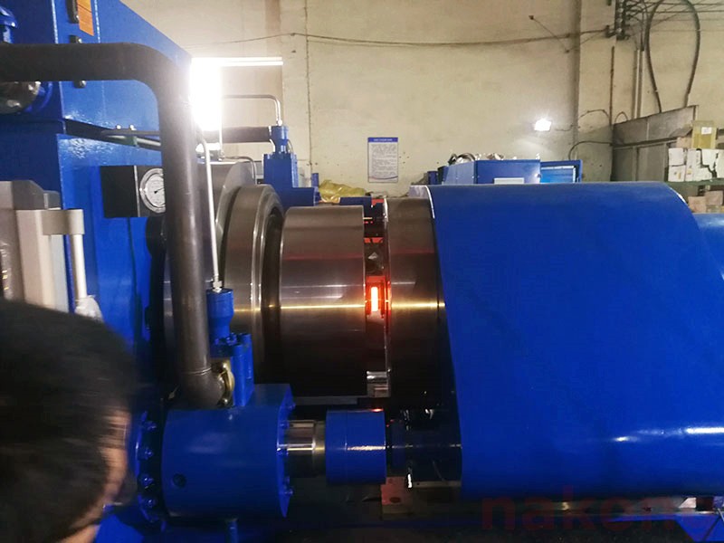 工件裝入旋轉卡盤并夾緊 → 工件裝入固定卡盤并夾緊 → 滑臺前進到設定位置→ 預頂鍛測量出焊接零位 → 滑臺后退到預定位置 → 主軸旋轉旋轉至設定焊接轉速 → 施加設定的軸向頂鍛力焊接 → 主軸轉速為零時在設定時間和設定的保壓壓力下保壓 → 保壓結束→ 旋轉端卡盤松開 → 滑臺退回基位 → 固定端卡盤松開 → 焊接完成。